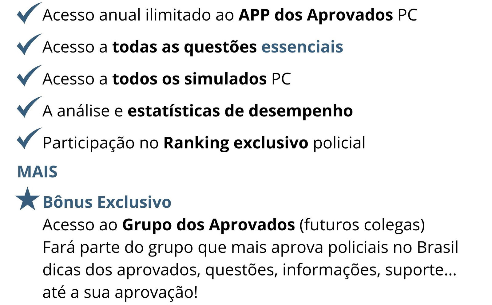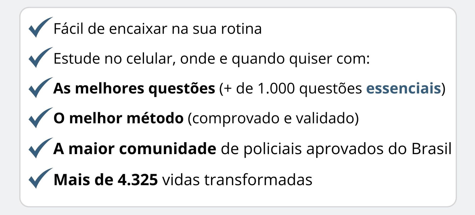 Assinatura anual. Tempo mais do que suficiente pra garantir sua aprovação — mesmo que você trabalhe o dia todo e só tenha 2hs por dia pra estudar. O app foi feito pra te aprovar rápido, como já fez com mais de 4.325 alunos aprovados.